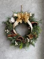 華やかなクリスマスリース。直径40cmで存在感抜群。モミ枝、ヒムロ杉、ヒノキ枝、松笠、シナモンを贅沢に使用。赤、ゴールド、シルバーのリボンが華やか。部屋を一気にクリスマスムードに包み込む、特別な季節の演出を楽しめます。